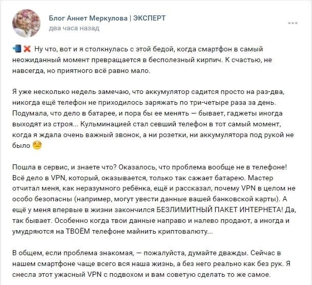 Там знаете ли большие, злые крокодилы, вирусы и ничего не работает. Почитайте, это просто ухахатбл. Кремлевским похоже дали новую методичку, ибо Роскомпозор не может никак справится с VPN лазейкой. Решили писать в отзывах такие пугалки для малограмотных пользователей, из серии поставил этот впн и телефон перестал работать и безлимит закончился, короче ужас-ужас. Просто ржака. Обидно, что многие ведь поверят в эту чушь.